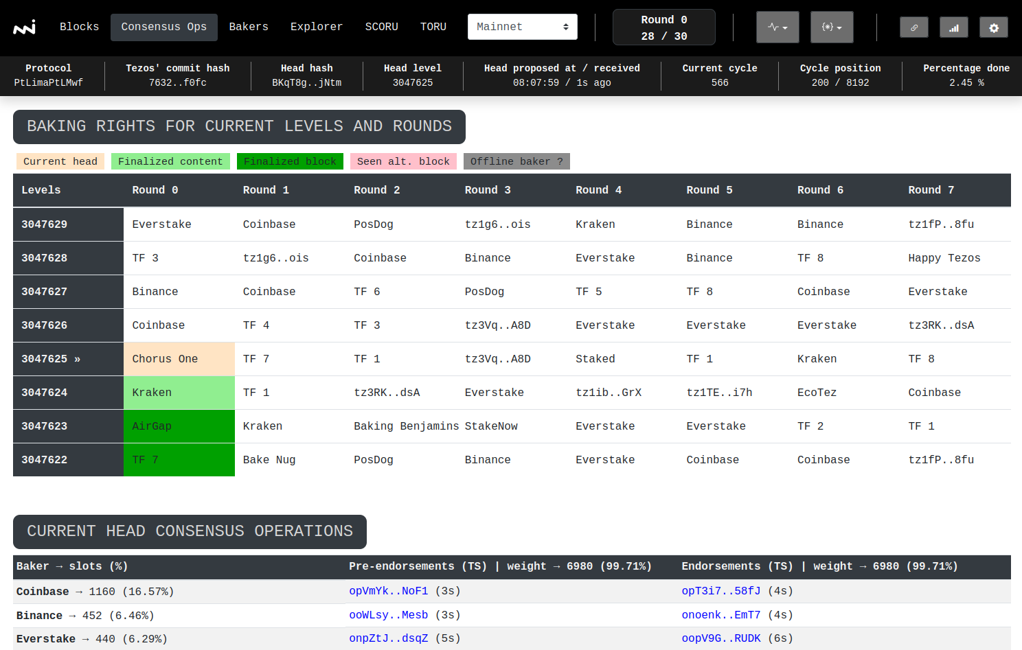 One of the main features of Explorus is the ability to observe the current, future, and past baking rights for a convenient number of levels and rounds, hence the nice view of the current state of the consensus from the bakers' perspective.
