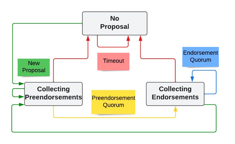 Should a preendrosement quorum be observed, the automaton moves to the CE state (yellow transition) to monitor endorsement quorums (blue transition). As an improvement, we could also detect endorsement quorums while collecting preendorsements. Indeed, a baker might observe an endorsement quorum but no preendrosement quorum (which may not happen if preendorsements are lost).
