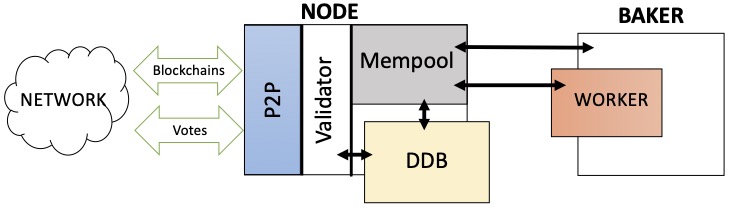 Before digging into more details about the baker, let's introduce some high level (somehow simplistic) concepts about the Tezos node's architecture: